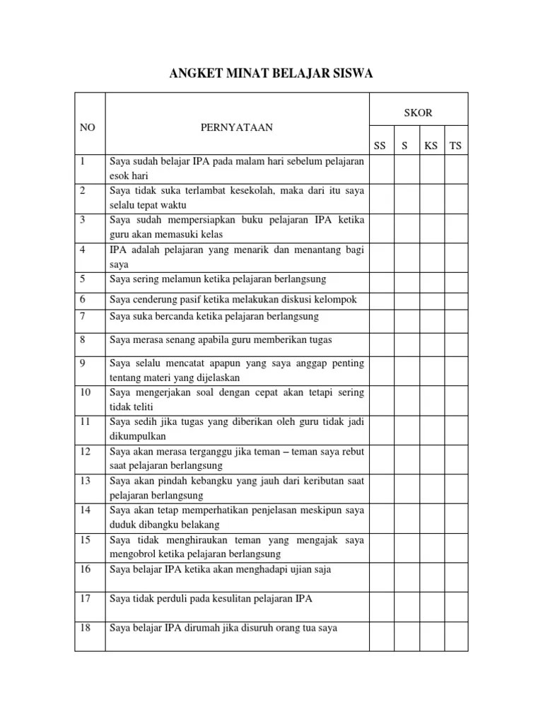 Minat belajar angket minat belajar mahasiswa pada mata. Selamat datang kembali di blog sederhana . Angket minat siswa dalam mata pelajaran bahasa inggris. Angket ini diadopsi dari attitude motivation test battery (amtb). Contoh angket skripsi (minat belajar).